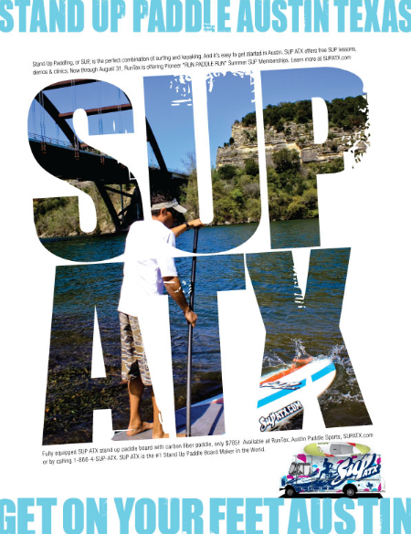 SUP Austin is a trademark of SUP ATX, the #1 stand up paddle board maker in the world based in Austin, TX. Below is the Spring 2010 line of stand up paddle boards offered by SUP ATX. They each come fully equipped, include a carbon fiber paddle and shipping!